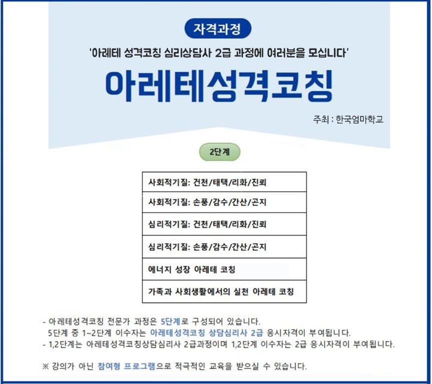 | 제목 | <마감> 아레테 성격코칭 2급과정 2단계 모집 | ||