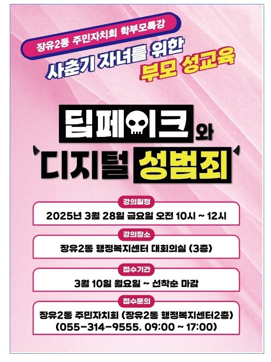 장유2동 주민자치회에서 학부모 특강 [사춘기 자녀를 위한 부모 성교육 - 딥페이크와 디지털 성범죄]이 무료로 진행됩니다.
