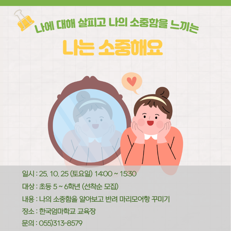 초등학생(5,6학년)을 위한 생명존중 교육 [소중한 나] 강의가 10/25일 토요일에 진행 됩니다.
