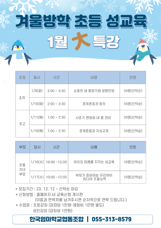 | 제목 | <마감>겨울방학 초등 성교육 특강 | ||